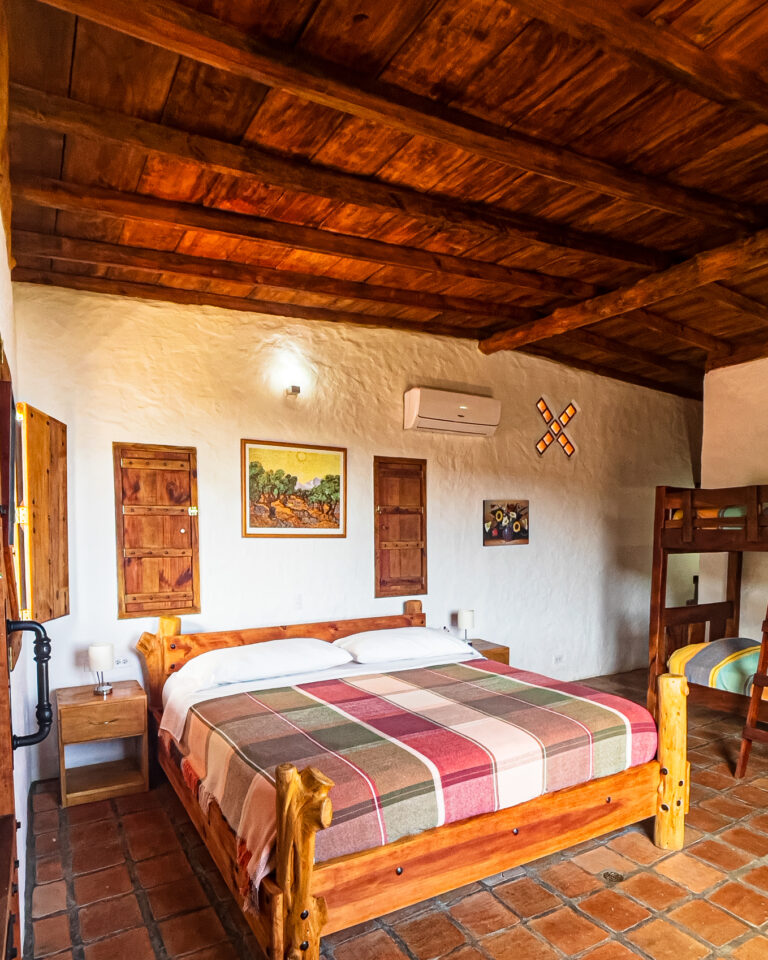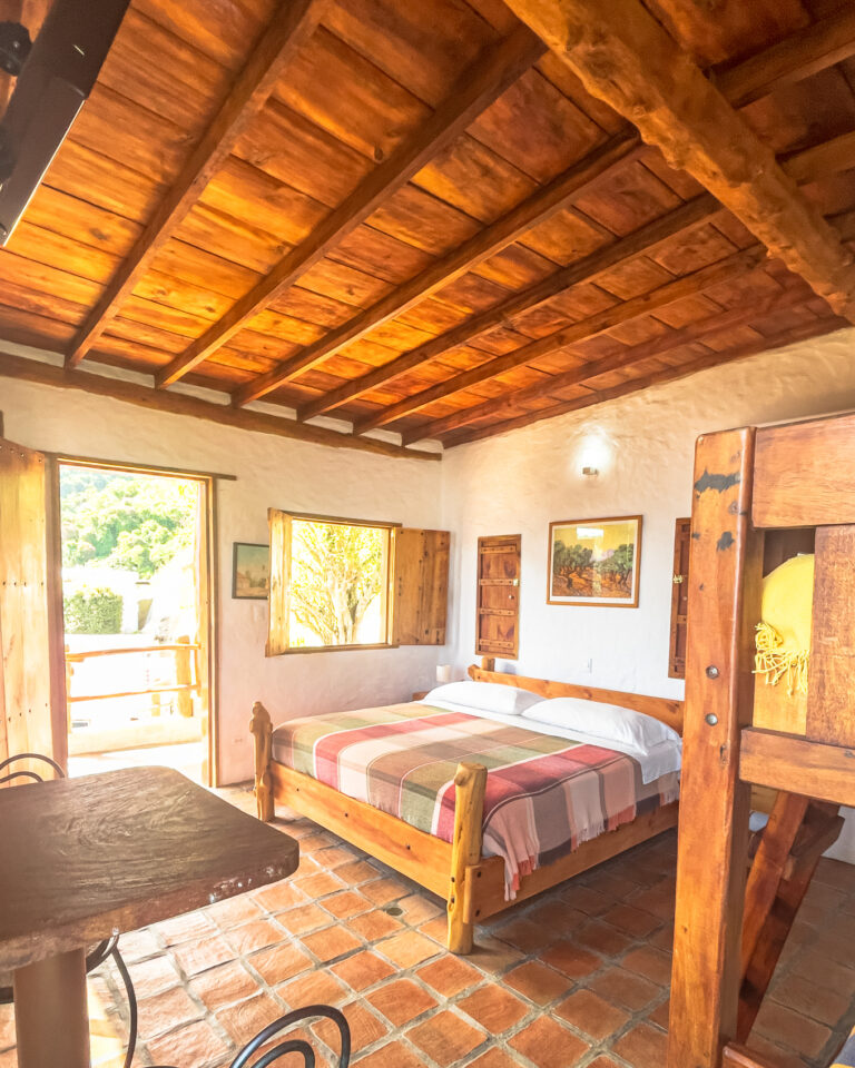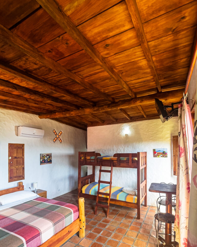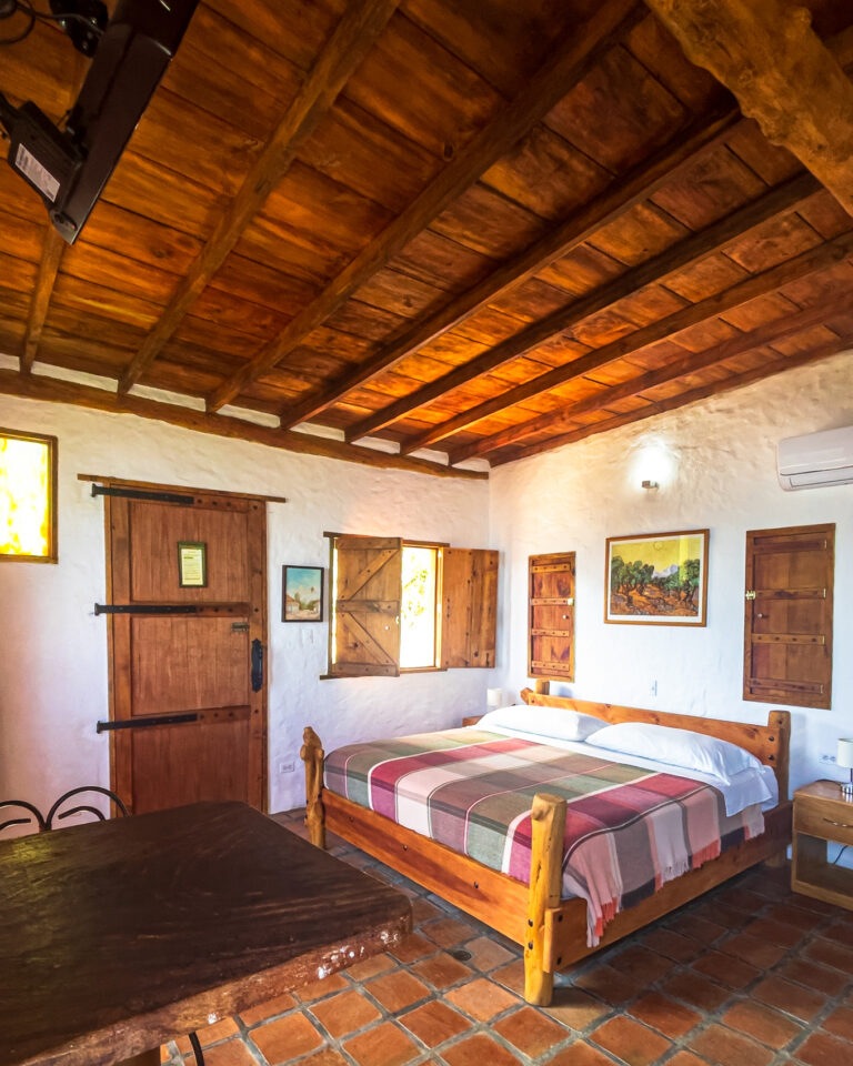 Con capacidad para hasta cuatro personas, dispone de una cama king y una litera individual. En su interior encontrarás baño privado con agua caliente, clóset, lencería, nevera ejecutiva, televisor con cable y conexión WiFi. La mesa comedor está ubicada dentro de la cabaña, perfecta para desayunar con calma o cenar en privacidad.